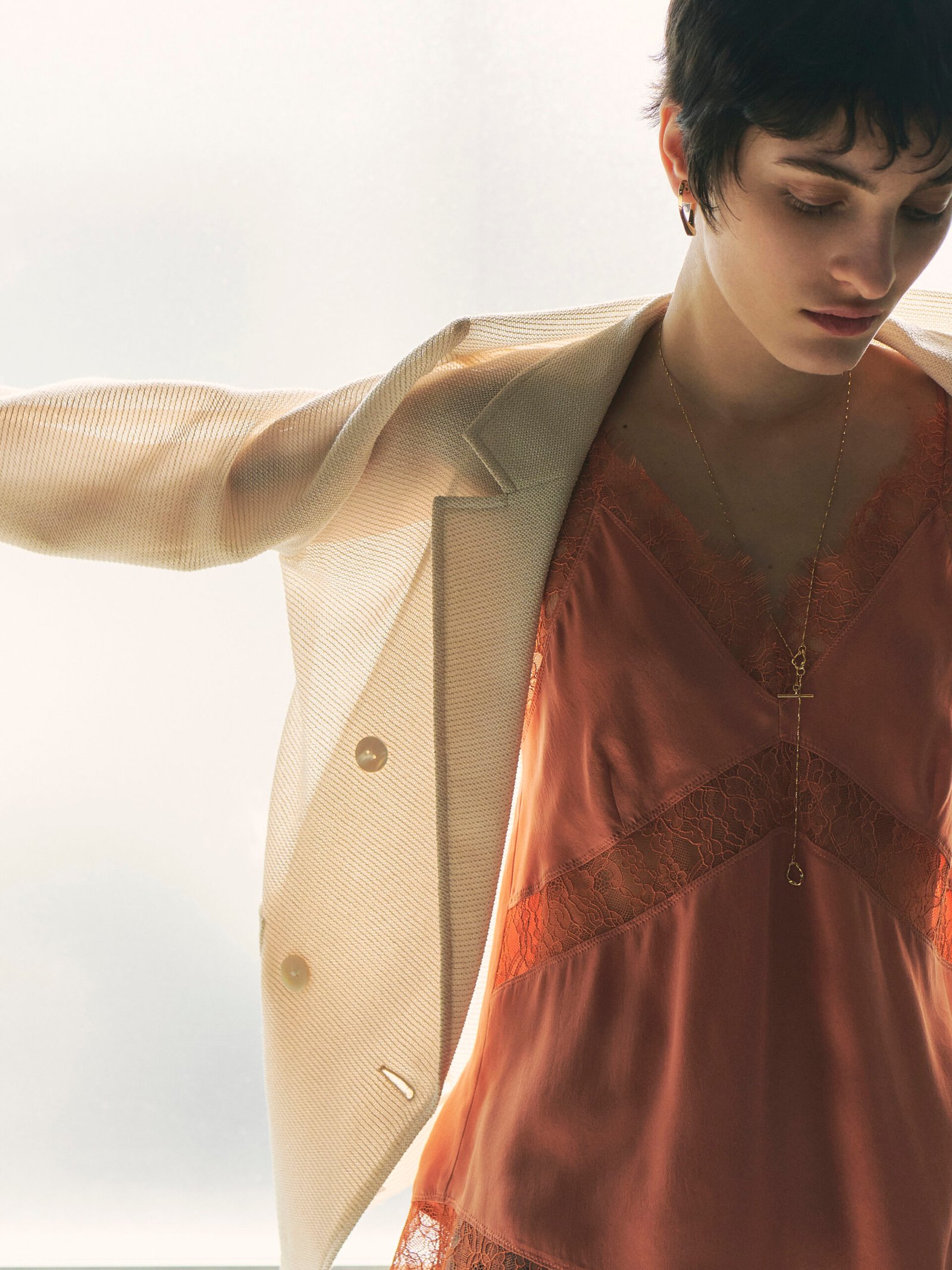 “A camisole made of luxurious sand-washed silk with a soft and supple touch like suede. The powdery touch and the fine drape unique to silk enhance femininity.”